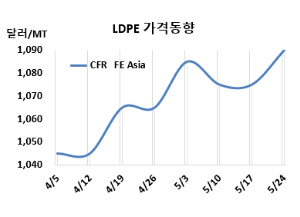 LDPE 시세는 5월22일 CFR FE Asia가 톤당 1090달러로 15달러, CFR SE Asia는 1130달러로 10달러 상승했다. CFR India는 1195달러로 변동이 없었다. 유럽도 5월24일 FD NWE 톤당 1190유로로 보합세를 형성했다.