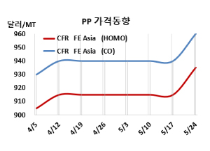 아시아 PP 시세는 5월22일 CFR FE Asia 기준 라피아(Raffia) 및 인젝션(Injection) 그레이드가 톤당 935달러, IPP Film 및 BOPP는 945달러, 블록 코폴리머(Block Copolymer)도 960달러로 각각 20달러 상승했다. CFR SE Asia는 라피아 및 인젝션 990달러, IPP Film 및 BOPP 1000달러, 블록 코폴리머 1023달러로 변동이 없었다. CFR S Asia 역시 라피아·인젝션 1010달러, BOPP 및 IPP Film 1030달러, 블록 코폴리머 1045달러로 변동이 없었다.