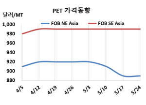 PET(Polyethylene Terephthalate)는 인디아가 상승했다. 병(Bottle) 그레이드 PET 시세는 5월22일 FOB NE Asia가 890달러, FOB SE Asia는 990달러로 변동이 없었다. CFR S Asia는 1000달러로 25달러 상승했다. 유럽은 5월24일 FD NWE가 톤당 1120유로로 20달러 올랐다. 미국도 DDP West Coast가 1410달러로 40달러 상승했다. 표, 그래프: <PET 가격동향> <화학저널 2024/05/30> |