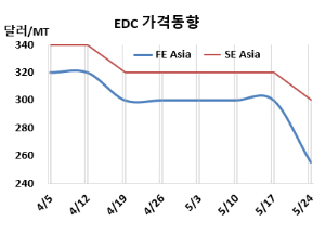 EDC(Ethlyene Dichloride)는 하락했다. EDC 시세는 5월24일 CFR FE Asia가 톤당 255달러로 45달러, CFR SE Asia는 300달러로 20달러 하락했다. 유럽은 FOB NWE 245달러로 변동이 없었다. 표, 그래프: <EDC 가격동향> <화학저널 2024/05/31> |