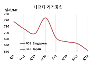 나프타(Naphtha)는 하락했다. 나프타 시세는 5월24일 C&F Japan 톤당 672달러로 11달러 하락했다. 표, 그래프: <Naphtha 가격동향> <화학저널 2024/05/31> |