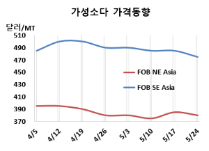 가성소다(Caustic Soda)는 하락했다. 가성소다 시세는 5월24일 FOB NE Asia가 톤당 380달러로 5달러 하락했고 CFR SE Asia는 475달러로 10달러 떨어졌다. 표, 그래프: <Caustic Soda 가격동향> <화학저널 2024/05/31> |