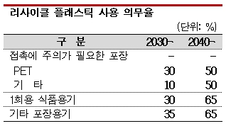 리사이클 플래스틱 의무 사용량은 용도와 소재별로 다르나 2030년부터 10-35%, 2040년부터 50-65%로 정했으며, 순환경제 이행을 목표로 2029년까지 1회용 플래스틱과 금속으로 만든 식품용 용기는 90%를 회수할 방침이다.