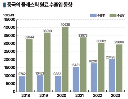 중국은 2023년 플래스틱 원료 수출량이 2049만3000톤으로 전년대비 13% 급증하며 사상 최초로 2000만톤대를 돌파했고 수입량은 2960만6000톤으로 3% 줄어들면서 3년 연속 감소세를 기록해 조만간 수출국으로 전환될 가능성이 높은 것으로 평가되고 있다.