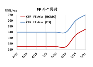 PP(Polypropylene)는 상승했다. 아시아 PP 시세는 5월29일 CFR FE Asia 기준 라피아(Raffia) 및 인젝션(Injection) 그레이드가 톤당 945달러, IPP Film 및 BOPP는 955달러, 블록 코폴리머(Block Copolymer)는 970달러로 각각 10달러 상승했다. CFR SE Asia는 라피아 및 인젝션 995달러, IPP Film 및 BOPP 1005달러, 블록 코폴리머 1028달러로 각각 5달러 올랐다. CFR S Asia는 라피아·인젝션 1020달러, BOPP 및 IPP Film 1040달러, 블록 코폴리머 1055달러로 각각 10달러 상승했다. 표, 그래프: <PP 가격동향> <화학저널 2024/06/04> |