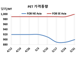 PET(Polyethylene Terephthalate)는 상승했다. 병(Bottle) 그레이드 PET 시세는 5월29일 FOB NE Asia가 900달러, FOB SE Asia는 1000달러로 각각 10달러씩 상승했다. CFR S Asia는 1035달러로 35달러 상승했다. 유럽은 5월31일 FD NWE가 톤당 1120유로로 변동이 없었다. 미국은 DDP West Coast가 1425달러로 15달러 상승했다. 표, 그래프: <PET 가격동향> <화학저널 2024/06/05> |