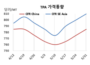PTA(Purified Terephthalic Acid)는 상승했다. PTA 시세는 5월31일 CFR China가 톤당 785달러로 10달러 상승했고, CFR SE Asia는 800달러로 변동이 없었다. CFR India는 885달러로 10달러 올랐다. 표, 그래프: <TPA 가격동향> <화학저널 2024/06/05> |