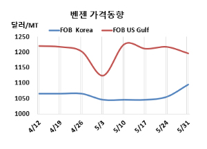벤젠 시세는 5월31일 FOB Korea가 톤당 1095달러로 40달러, CFR SE Asia는 1075달러로 35달러, CFR India는 1100달러로 40달러 상승했다. CFR China는 1115달러, CFR Taiwan은 1135달러로 역시 40달러 올랐다. 표, 그래프: <Benzene 가격동향> |