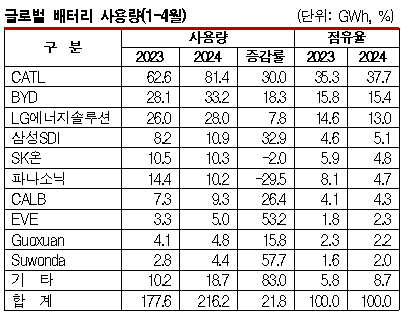 국내 전기자동차(EV) 3사의 시장점유율 하락이 계속되는 가운데 삼성SDI와 SK온이 파나소닉(Panasonic)을 제치고 글로벌 5위에 이름을 올렸다. 표, 그래프: <글로벌 배터리 사용량(1-4월)> <화학저널 2024/06/05> |