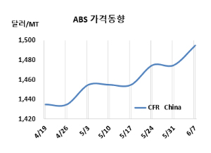 ABS(Acrylonitrile Butadiene Styrene)는 상승했다. ABS 시세는 6월5일 CFR China가 톤당 1495달러, CFR SE Asia는 1515달러로 각각 20달러 상승했다. CFR S Asia는 1535달러로 20달러 올랐다. 유럽 시장은 6월7일 FD NWE 톤당 2030유로로 변동이 없었다. 표, 그래프: <ABS 가격동향> <화학저널 2024/06/11> |