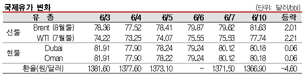 6월10일 국제유가는 여름철 여행수요 증가를 타고 상승했다. 국제유가는 여름철 여행수요가 증가할 것이라는 기대가 확산됨에 따라 상승했다. 표, 그래프: <국제유가 변화> <화학저널 2024/06/11> |