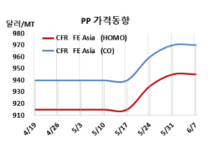 6월 중국에 공급하는 호모(Homo) 그레이드에 대해 중동이 CFR 960달러를, 사우디가 CFR 930달러를 제시했다. 베트남에는 사우디가 CFR 1010달러를, 중동이 CFR 980달러를 요구했다. 인디아 릴라이언스(Reliance Industries)는 6월1일 PP RCP 그레이드를 동결하고 나머지는 kg당 1.5루피 인상했다.