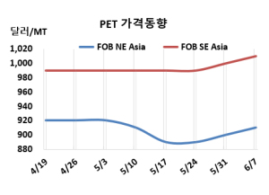 PET(Polyethylene Terephthalate)는 상승했다. 병(Bottle) 그레이드 PET 시세는 6월5일 FOB NE Asia가 910달러, FOB SE Asia는 1010달러로 각각 10달러씩 상승했다. CFR S Asia는 1060달러로 25달러 올랐다. 유럽도 6월7일 FD NWE가 톤당 1130유로로 10달러 상승했다. 미국은 DDP West Coast가 1425달러로 변동이 없었다. 표, 그래프: <PET 가격동향> <화학저널 2024/06/13> |