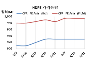 7월 중국에 공급하는 필름(Film) 그레이드에 대해 역외물량이 CFR 980-1010달러를 제시했다. 베트남에는 역외물량이 CFR 1000-1040달러를 요구했다. 인디아에는 역외물량이 CFR 1010-1050달러를 제시했다. 인디아 릴라이언스(Reliance Industries)는 6월13일 HDPE 가격을 기본 kg당 2루피, Pipe 그레이드를 kg당 2루피 인상했다.