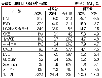 국내 전기자동차(EV) 3사는 글로벌 배터리 시장에서 중국에 계속 밀리고 있다. 표, 그래프: <글로벌 배터리 사용량(1-5월)> <화학저널 2024/07/03> |