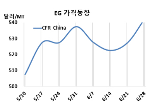 CFR China 543달러로 15달러 상승 … 원료 에틸렌‧PTA도 오름세