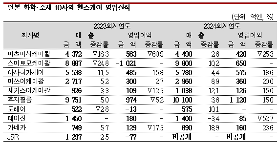 일본 화학기업들은 헬스케어 사업을 석유화학 불황에 대응할 새로운 수익원으로 육성하고 있으며 주요 10사 중 JSR과 테이진(Teijin)을 제외한 8사가 2024년 매출 증가를, 7사는 영업이익 증가를 전망한 것으로 파악된다.