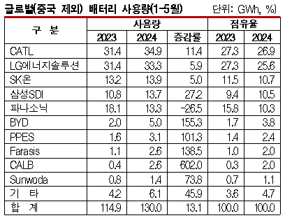 국내 배터리 3사는 중국 이외 시장에서도 중국의 성장세에 밀리고 있다. 표, 그래프: <글로벌(중국 제외) 배터리 사용량(1-5월)> <화학저널 2024/07/05> |