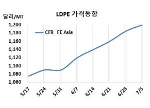 LDPE 시세는 7월3일 CFR FE Asia가 톤당 1200달러로 15달러, CFR SE Asia는 1300달러로 15달러 상승했다. CFR India는 1270달러로 5달러 상승에 그쳤다. 유럽은 7월5일 FD NWE 톤당 1200유로로 변동이 없었다.동북아 시세가 1200달러를 형성한 건 2022년 7월29일 1200달러를 형성한 이후 약 2년만에 처음이다.