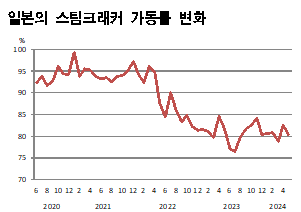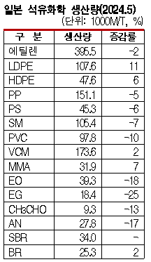 일본은 에틸렌(Ethylene) 생산량이 감소했다. 표, 그래프: <일본의 스팀크래커 가동률 변화, 일본 석유화학 생산량(2024.5)> <화학저널 2024/07/08> |