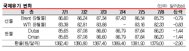 7월8일 국제유가는 허리케인 베릴의 세력 약화 영향이 계속되며 하락했다. 국제유가는 허리케인 약화에 따른 공급차질 우려 완화를 타고 하락했다. 표, 그래프: <국제유가 변화> <화학저널 2024/07/09> |