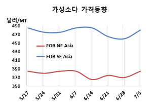 가성소다(Caustic Soda)는 상승했다. 가성소다 시세는 7월5일 FOB NE Asia가 톤당 385달러로 15달러, CFR SE Asia는 480달러로 20달러 상승했다. 표, 그래프: <Caustic Soda 가격동향> <화학저널 2024/07/12> |