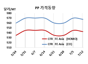 원료 프로필렌(Propylene)은 7월9일 CFR China 톤당 875달러로 5달러, FOB Korea는 850달러로 15달러 상승했다. PP(라피아: CFR FE Asia)와 프로필렌(CFR China)의 스프레드는 톤당 68달러로 7달러 줄어들면서, 손익분기점 150달러를 크게 밑돌아 적자가 심화되고 있는 것으로 분석된다.