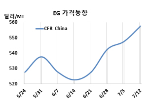 MEG(Monoethylene Glycol)는 상승했다. MEG 시세는 7월12일 CFR China가 톤당 558달러로 10달러, CFR SE Asia는 568달러로 10달러 상승했다. 표, 그래프: <EG 가격동향> <화학저널 2024/07/18> |