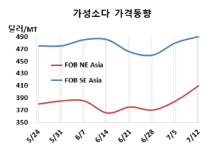 가성소다 시세는 7월12일 FOB NE Asia가 톤당 410달러로 25달러, CFR SE Asia는 490달러로 10달러 상승했다.