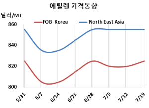 에틸렌 시세는 7월19일 CFR NE Asia가 톤당 855달러, CFR SE Asia는 925달러로 변동이 없었다. FOB Korea는 825달러로 5달러 상승에 그쳤다.