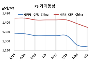 GPPS, CFR China 1270달러로 10달러 하락 … 재고누적 걱정에 약화