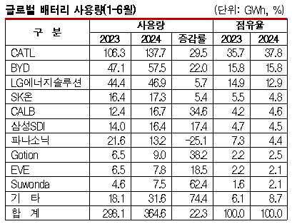 국내 배터리 3사는 전기자동차(EV) 캐즘(Chasm: 일시적 수요 정체)에도 성장세를 이어가고 있다. 표, 그래프: <글로벌 배터리 사용량(1-6월)> <화학저널 2024/08/07> |