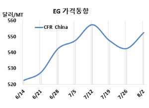 MEG(Monoethylene Glycol)는 상승했다. MEG 시세는 8월2일 CFR China가 톤당 553달러로 10달러, CFR SE Asia는 563달러로 10달러 상승했다. 표, 그래프: <EG 가격동향> <화학저널 2024/08/08> |