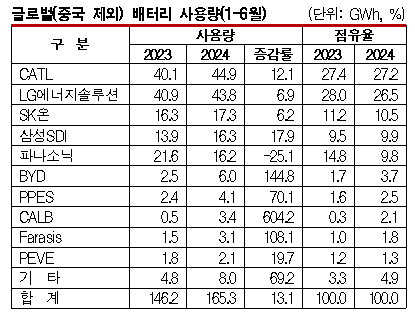 중국산 배터리는 중국을 제외한 글로벌 시장에서도 성장세를 이어가고 있다. 표, 그래프: <글로벌(중국 제외) 배터리 사용량(1-6월)> <화학저널 2024/08/09> |