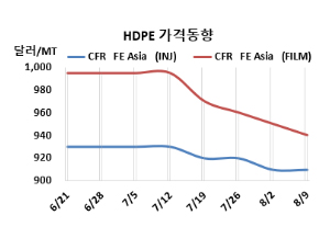 HDPE(High-Density Polyethylene)는 일부 하락했다. HDPE 시세는 8월7일 인젝션(Injection) 그레이드 기준 CFR FE Asia가 톤당 910달러로 변동이 없었으나, CFR SE Asia는 985달러로 10달러 하락했다. 블로우몰딩(Blow-Molding)도 FEA가 920달러, SEA는 990달러로 변동이 없었다. 필름(Film)은 FEA가 940달러, SEA는 985달러로 각각 10달러씩 하락했다. 얀(Yarn)도 FEA가 965달러, SEA는 1030달러로 각각 10달러씩 떨어졌다. 표, 그래프: <HDPE 가격동향> <화학저널 2024/08/12> |