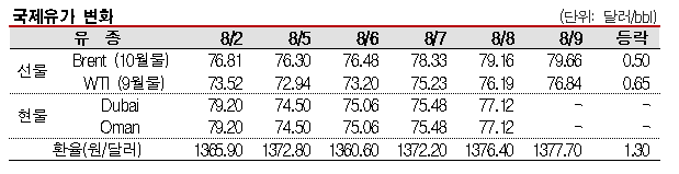8월9일 국제유가는 미국의 경기침체 우려가 완화됨에 따라 상승했다. 국제유가는 미국의 경기침체 우려가 완화된 영향으로 상승했다. 표, 그래프: <국제유가 변화> <화학저널 2024/08/12> |
