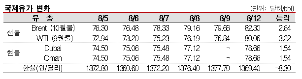 8월12일 국제유가는 중동지역 충돌 우려가 확대되며 폭등했다. 국제유가는 이란이 이스라엘에 대한 보복을 준비한다는 소식이 알려지며 하루만에 3.3% 이상 폭등했다. 표, 그래프: <국제유가 변화> <화학저널 2024/08/13> |