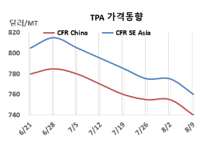 PTA(Purified Terephthalic Acid)는 하락했다. PTA 시세는 8월9일 CFR China가 톤당 740달러, CFR SE Asia는 760달러로 각각 15달러 떨어졌다. CFR India는 850달러로 25달러 떨어졌다. 표, 그래프: <TPA 가격동향> <화학저널 2024/08/16> |