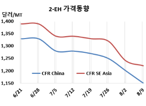 옥소알코올(Oxo-Alcohol)은 하락했다. 2-EH(Ethylhexanol)는 8월9일 CFR China가 톤당 1150달러로 50달러, CFR SE Asia는 1220달러로 20달러 하락했다. 표, 그래프: <2-EH 가격동향> <화학저널 2024/08/16> |