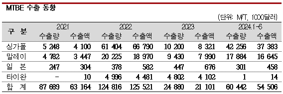 MTBE(Methyl tert-Butyl Ether)는 가격 하향세가 이어지고 있다. 표, 그래프: <MTBE 수출 동향> <화학저널 2024년 08월 19일> |