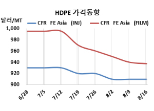 HDPE(High-Density Polyethylene)는 대체로 하락했다. HDPE 시세는 8월14일 인젝션(Injection) 그레이드 기준 CFR FE Asia가 톤당 910달러로 변동이 없었으나, CFR SE Asia는 975달러로 10달러 하락했다. 블로우몰딩(Blow-Molding)도 FEA가 920달러, SEA는 990달러로 변동이 없었다. 필름(Film)은 FEA가 938달러로 2달러, SEA는 975달러로 10달러 하락했다. 얀(Yarn)은 FEA가 955달러로 10달러 떨어졌으나, SEA는 1030달러로 변동이 없었다. 표, 그래프: <HDPE 가격동향> <화학저널 2024/08/19> |