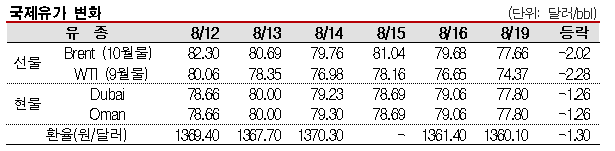 8월19일 국제유가는 이스라엘과 하마스의 휴전협상 타결 기대를 타고 급락했다. 국제유가는 이스라엘과 하마스의 휴전협상 타결에 대한 기대가 고조된 영향으로 급락했다. 표, 그래프: <국제유가 변화> <화학저널 2024/08/20> |