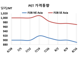 PET(Polyethylene Terephthalate)는 하락했다. 병(Bottle) 그레이드 PET 시세는 8월14일 FOB NE Asia가 890달러로 10달러, FOB SE Asia는 970달러로 5달러 하락했다. CFR S Asia는 1010달러로 10달러 떨어졌다. 유럽은 8월16일 FD NWE가 톤당 1165유로, 미국은 DDP West Coast가 1445달러로 변동이 없었다. 표, 그래프: <PET 가격동향> <화학저널 2024/08/22> |