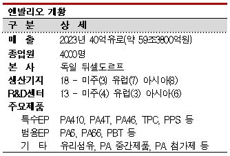 2023년 기준 매출은 40억유로(약 59조3800억원)로 EP 생산기업 가운데 글로벌 톱3로 평가된다. 엔발리오는 전기자동차 전환 및 탄소중립화 등의 영향으로 다양한 수요산업이 전환점을 맞이하는 가운데 고기능 소재로 니즈에 대응할 계획이다.