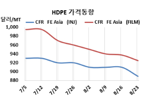 HDPE(High-Density Polyethylene)는 하락했다. HDPE 시세는 8월21일 인젝션(Injection) 그레이드 기준 CFR FE Asia가 톤당 890달러로 20달러, CFR SE Asia는 965달러로 10달러 하락했다. 블로우몰딩(Blow-Molding)은 FEA가 910달러로 10달러 하락했으나, SEA는 990달러로 변동이 없었다. 필름(Film)은 FEA가 925달러로 13달러 떨어졌으나, SEA는 975달러로 변동이 없었다. 얀(Yarn)은 FEA가 935달러로 20달러, SEA는 1020달러로 10달러 떨어졌다. 표, 그래프: <HDPE 가격동향> <화학저널 2024/08/26> |