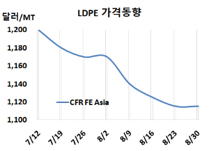 LDPE(Low-Density Polyethylene)는 변동이 없었다. LDPE 시세는 8월28일 CFR FE Asia가 톤당 1115달러, CFR SE Asia는 1200달러로 변동이 없었다. CFR India도 1170달러로 보합세에 그쳤다. 유럽만 8월30일 FD NWE 톤당 1270유로로 20유로 상승했다. 표, 그래프: <LDPE 가격동향> <화학저널 2024/09/02> |