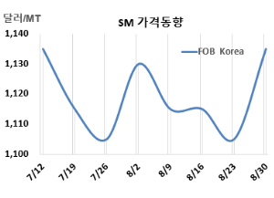 SM(Styrene Monomer)은 상승했다. SM 시세는 8월30일 FOB Korea가 톤당 1135달러, CFR SE Asia는 1195달러로 각각 30달러 상승했다. CFR China는 1155달러, CFR Taiwan은 1185달러, CFR India는 1175달러로 각각 30달러 올랐다. 표, 그래프: <SM 가격동향> <화학저널 2024/09/04> |