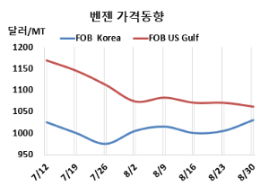 벤젠(Benzene)은 상승했다. 벤젠 시세는 8월30일 FOB Korea가 톤당 1030달러, CFR SE Asia는 1020달러, CFR India는 1035달러로 각각 25달러 상승했다. CFR China는 1050달러, CFR Taiwan은 1070달러로 각각 25달러 올랐다. 표, 그래프: <Benzene 가격동향> <화학저널 2024/09/04> |