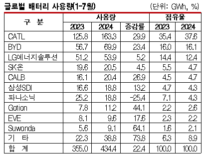 국내 배터리 3사는 전기자동차(EV) 캐즘(Chasm: 일시적 수요 정체)으로 성장세가 둔화됐다. 표, 그래프: <글로벌 배터리 사용량(1-7월)> <화학저널 2024/09/04> |