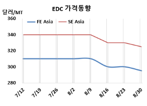 EDC 시세는 8월30일 CFR FE Asia가 톤당 295달러, CFR SE Asia는 325달러로 5달러 하락했다. 유럽도 FOB NWE 300달러로 변동이 없었다.